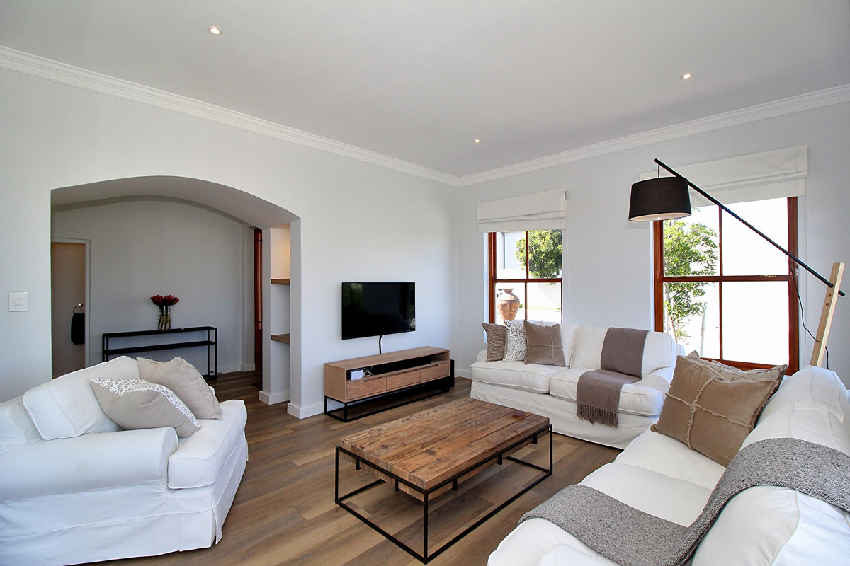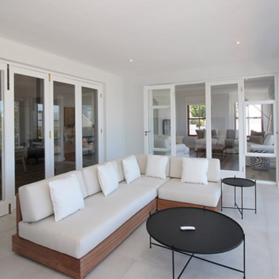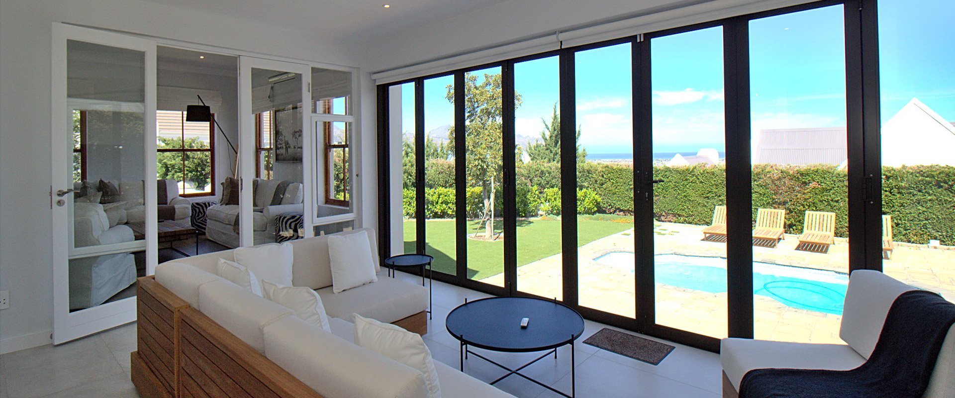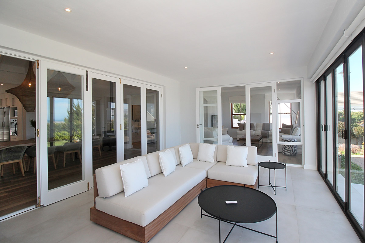 Ein großzügiger Wohn-und Essbereich mit überdachter, windgeschützter Terrasse gibt den Blick frei auf die False Bay, das Kap der guten Hoffnung und den Tafelberg.