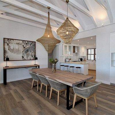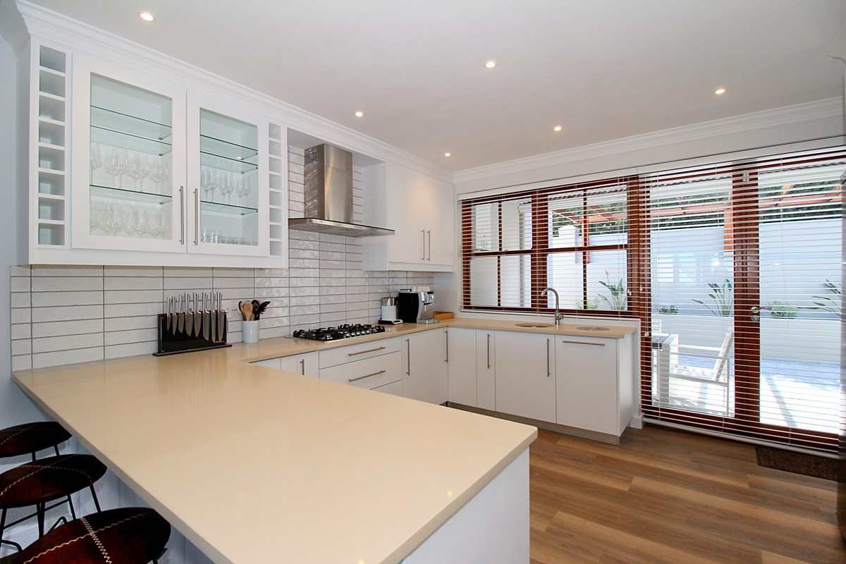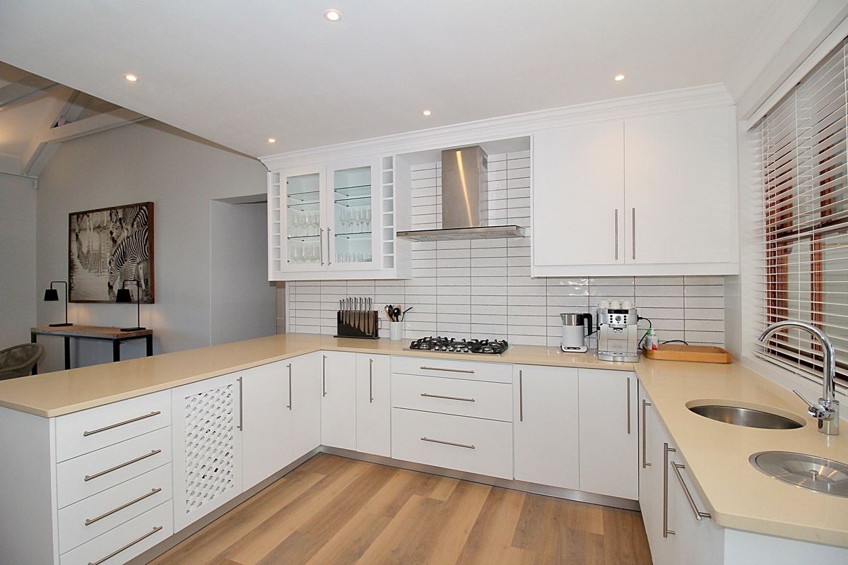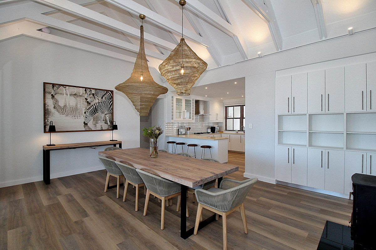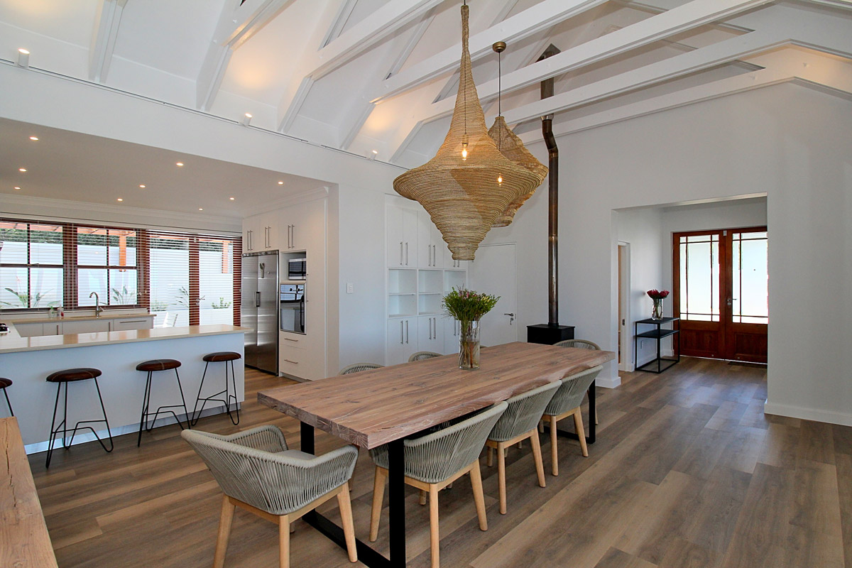 großer Wohn- und Essbereich mit offener Küche und Blick auf die False bay